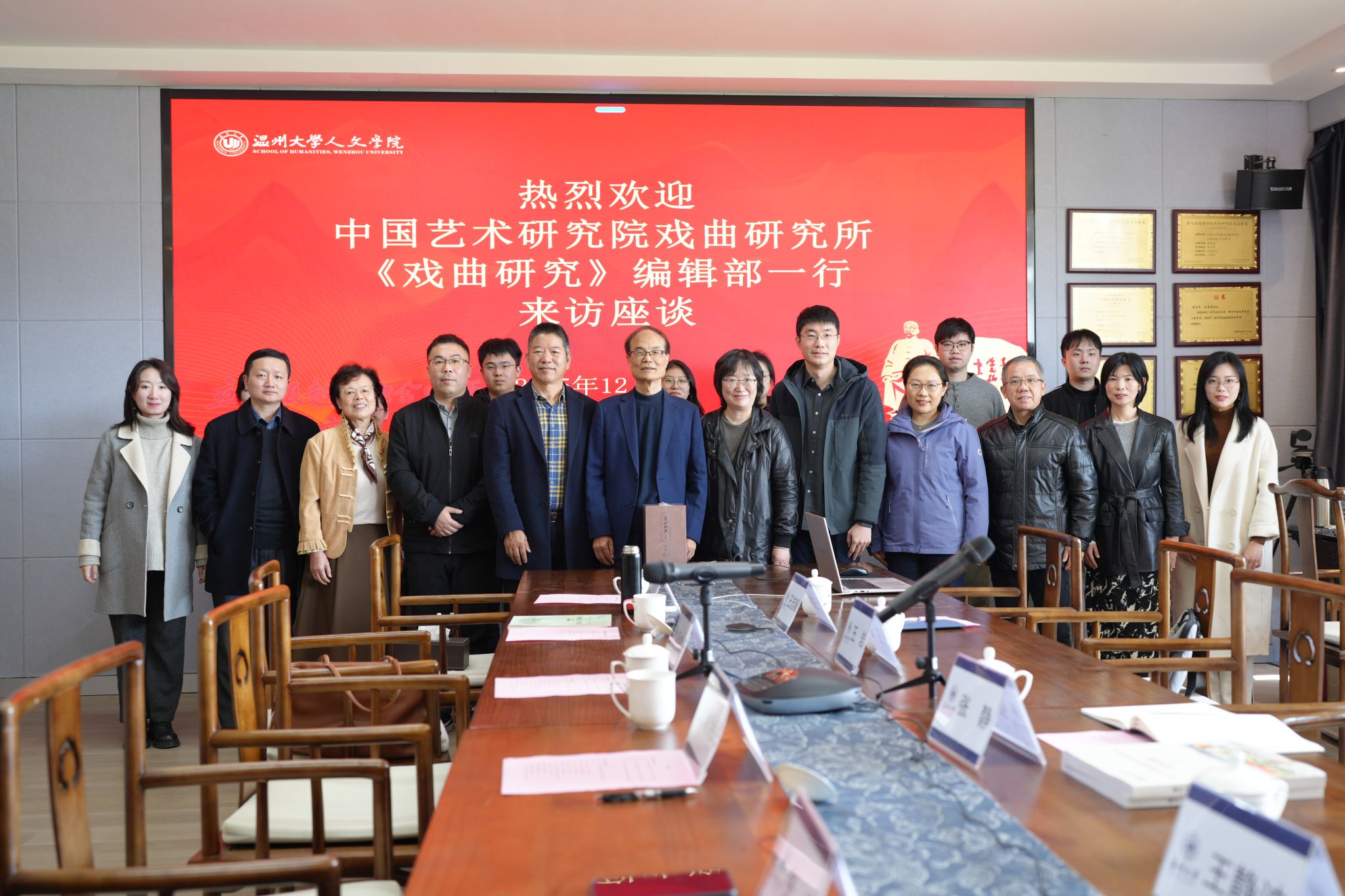 12月7日,中国艺术研究院戏曲研究所《戏曲研究》编辑部副主编张静、编辑部主任王静波、编辑王岩一行到访温州大学球探体育 ,与浙江传统戏曲研究与传承中心研究团队进行座谈。球探体育 院长孙良好、副院长张真,以及王汉民、孙蓉蓉、王志毅等,与来自温州商学院、温州理工学院的青年教师和温州大学的研究生代表一同参加了交流。本次座谈会由我校文科资深教授、浙江传统戏曲研究与传承中心首席专家俞为民主持。
