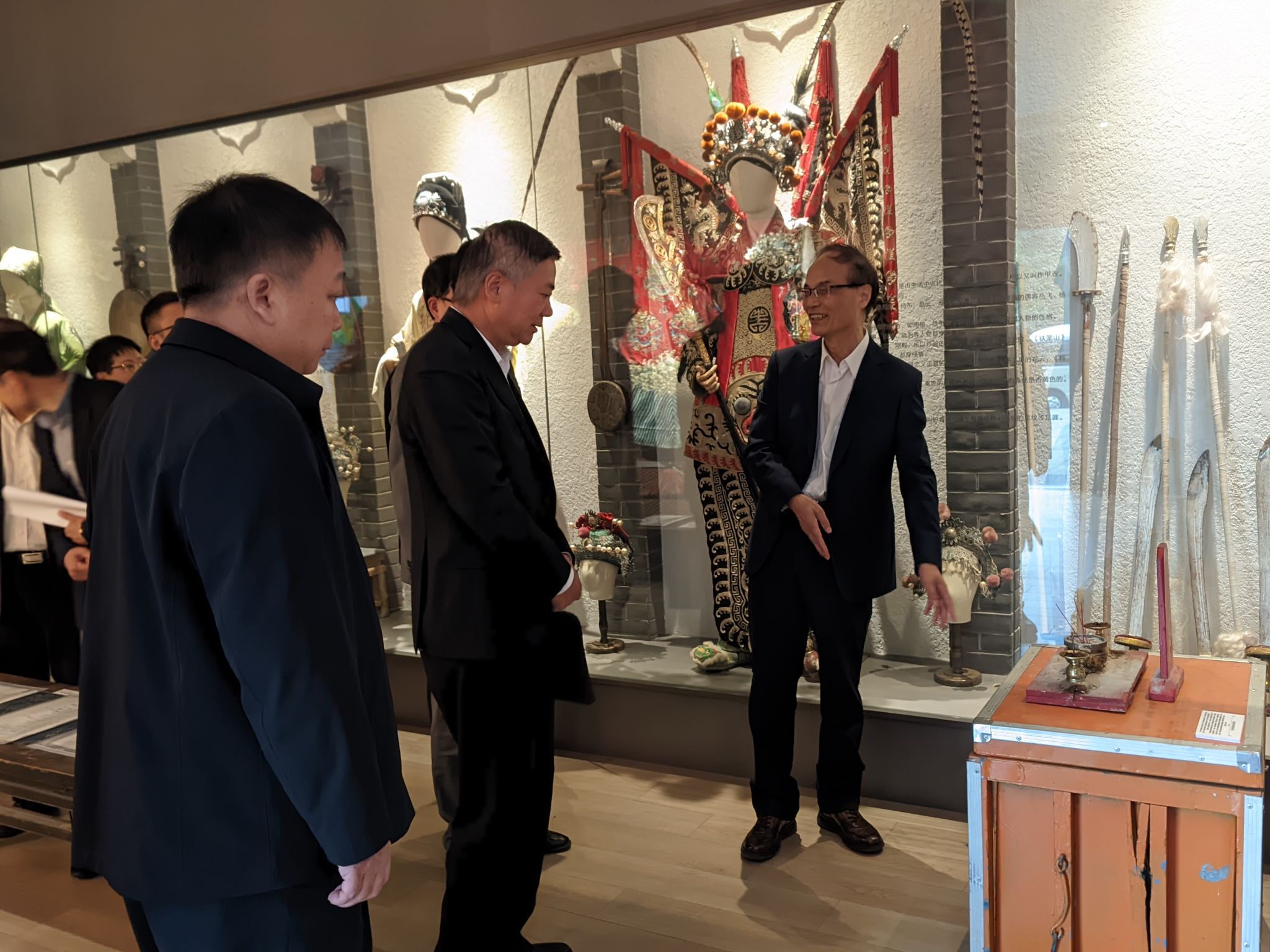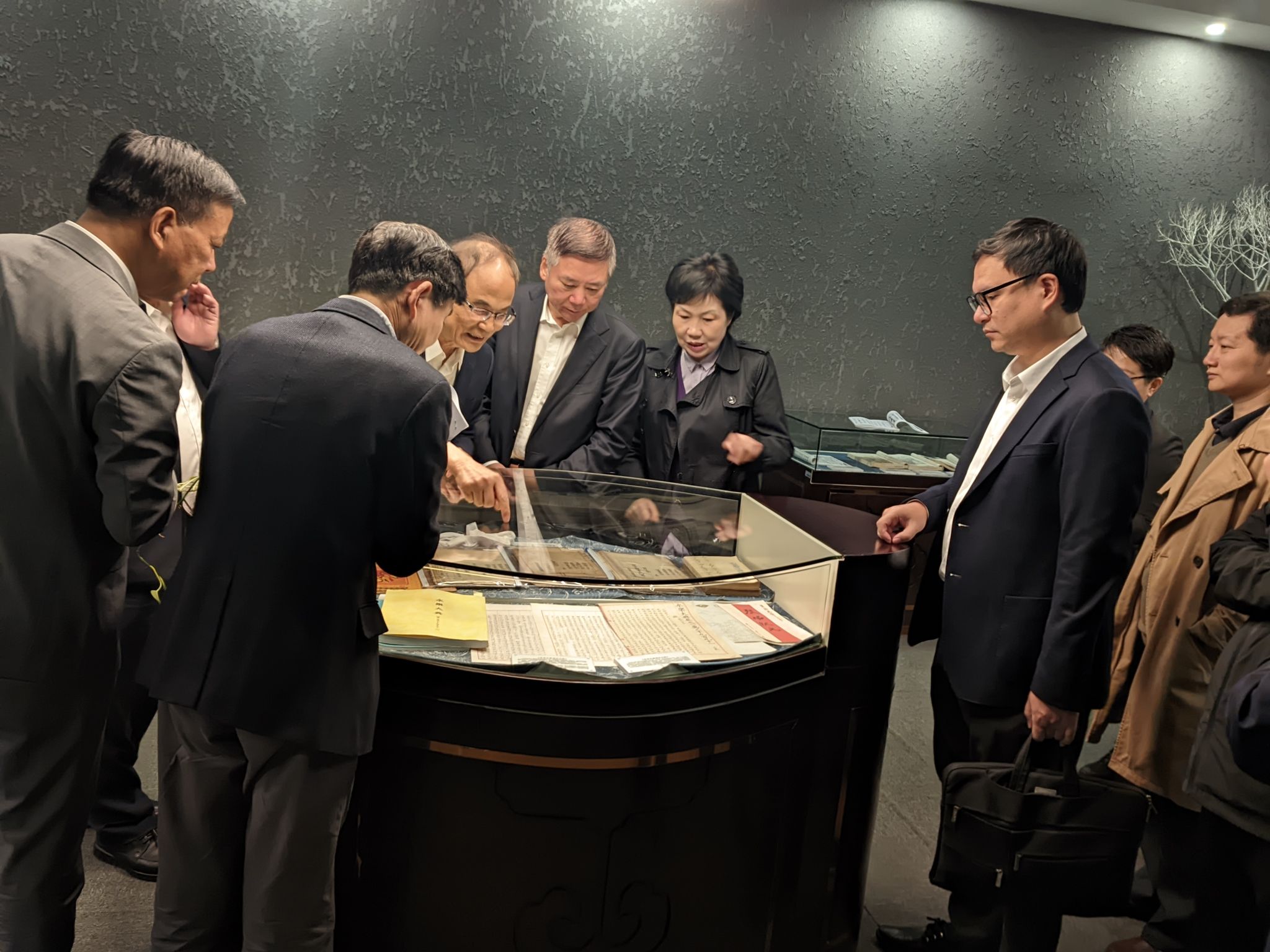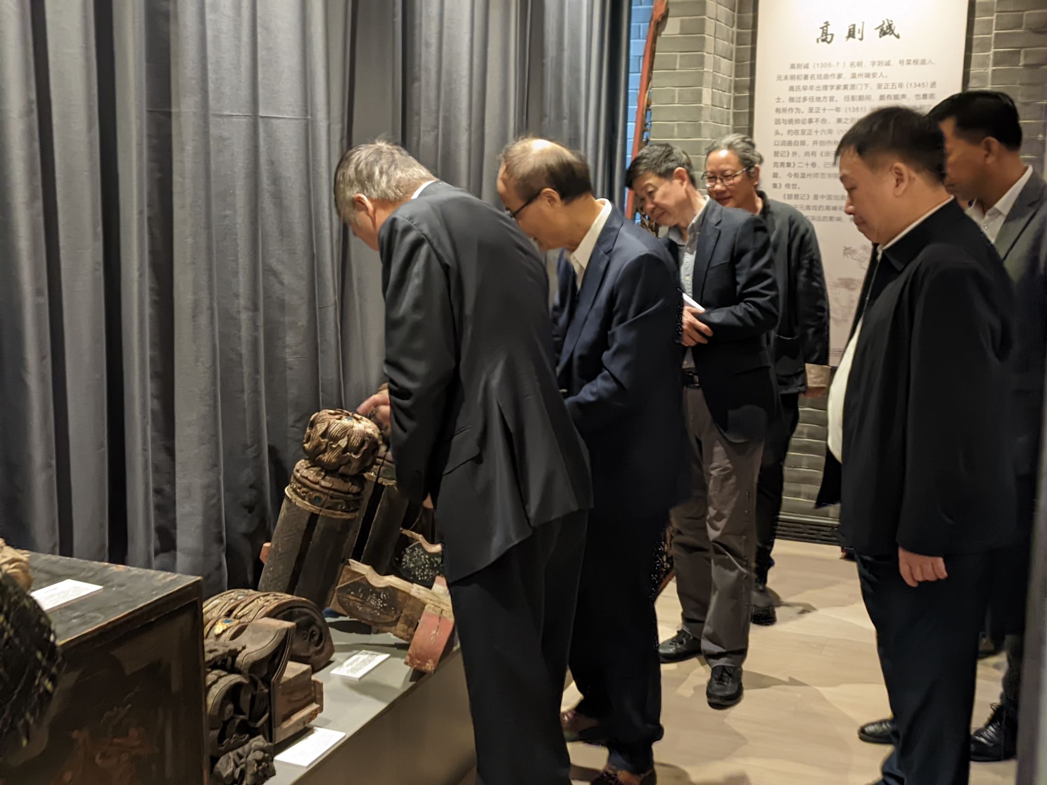 葛益平一行首先考察了温州大学浙江传统戏曲研究与传承中心,详细了解了基地在戏曲文物典藏、学术研究、人才培养等方面的进展情况。在珍贵的古籍文献前,葛益平仔细端详,认真听取了俞为民教授的介绍。基地丰富的馆藏和深厚的研究底蕴给考察组留下了深刻印象。