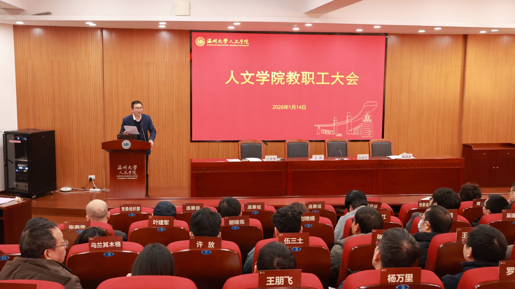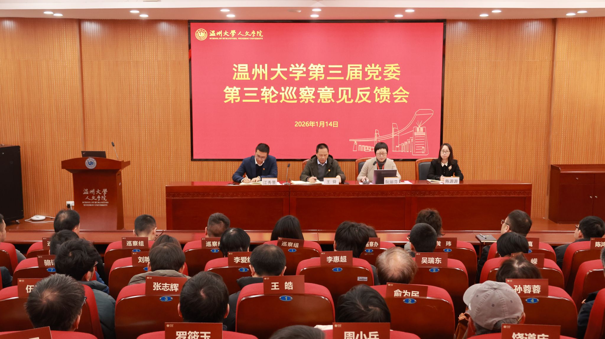 2026年1月14日下午13:00时,球探体育 在203会议室召开温州大学第三届党委第三轮巡察意见反馈会,会议由学院党委书记江秀景主持。王舜副校长、党委巡察办、党委组织部、巡察组,学院领导班子、全体教师参加此次会议。